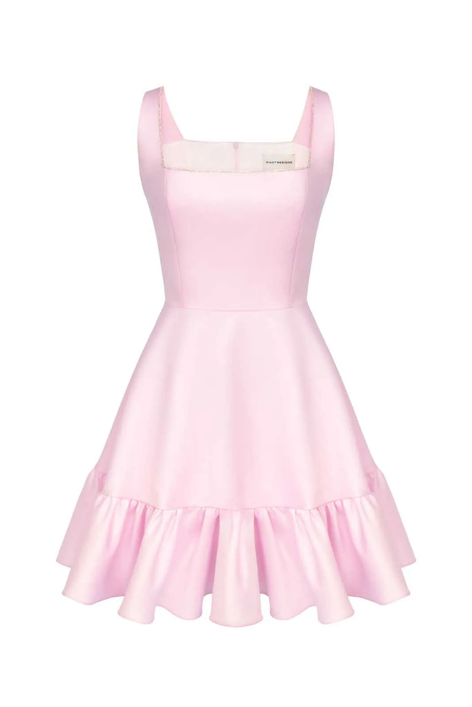 Bouncy, youthful, feminine, glowing - this is what you emit while wearing this mini dress with a flounce at the bottom. While keeping the design of the dress simple and airy chic, we added rhinestones all along the square neckline that is the most flattering for those with elegant small bust. The dress is made of polyester, which does not restrict movement and sits comfortably on the body. A light and airy dress can be matched with minimalistic pumps or sandals.