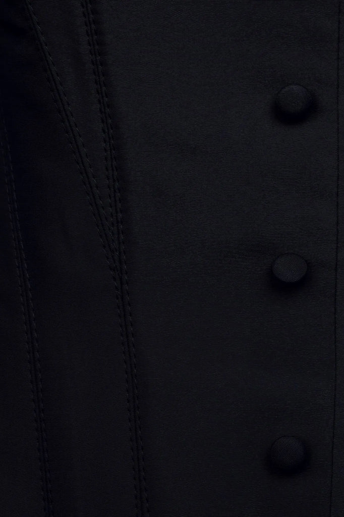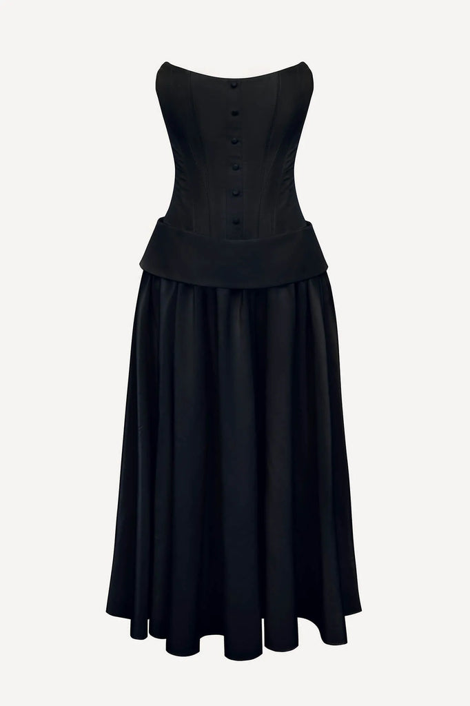 A striking set featuring a corset and a midi skirt in classic black. The button-front corset bodice accentuates the décolletage and sculpts the waist, while the full skirt with a folded hem lends the look femininity and delicate charm.
