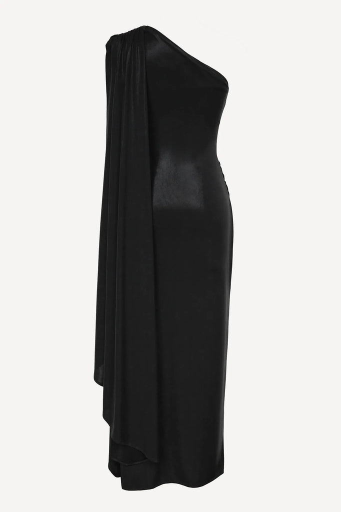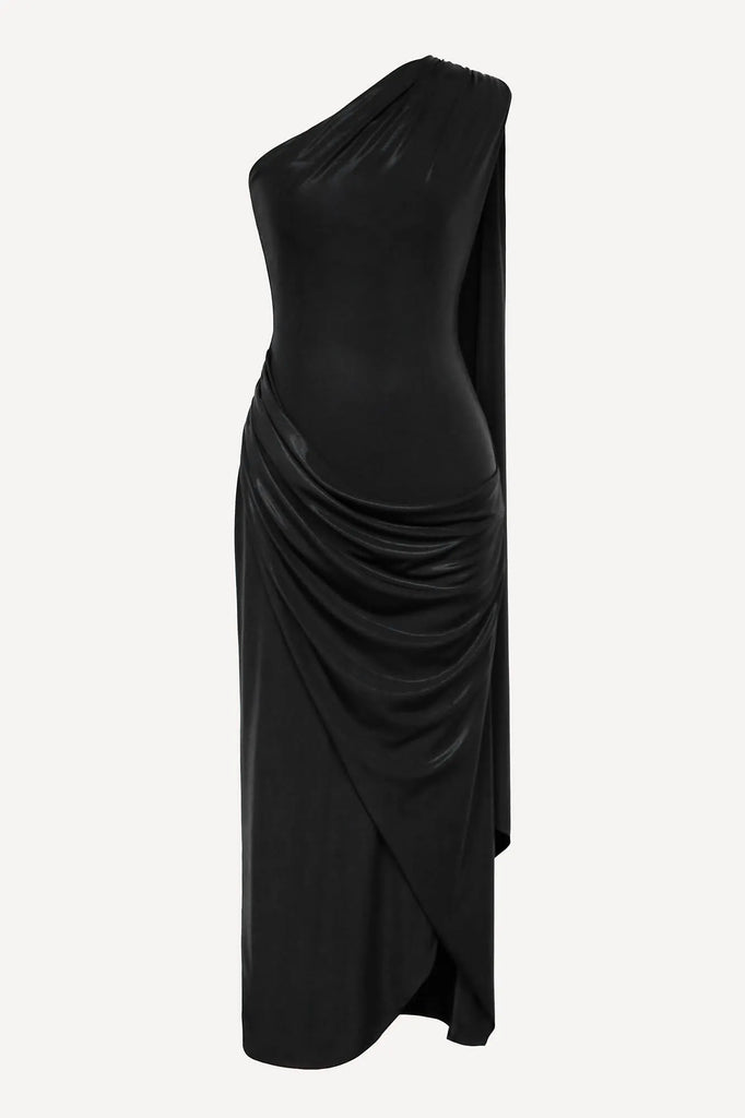 An elegant midi dress made of sparkling knitwear in black. Soft drapes, a wrap skirt, flowing fabric and a train falling from one shoulder will make your look truly festive and feminine, and an open shoulder will add a touch of fragility and elegance. The laconic cut can be easily complemented with various accessories, creating the necessary accents.