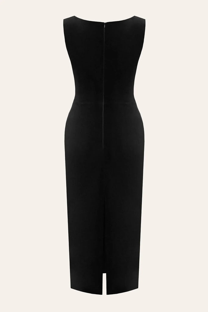 Silhouetted velvet midi length dress with wide straps in black. The square neckline accentuates the neckline and visually lengthens the neck. The bodice cut-off line and fitted silhouette perfectly accentuates the female figure.