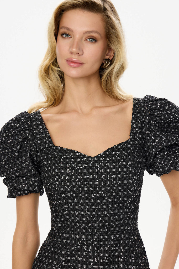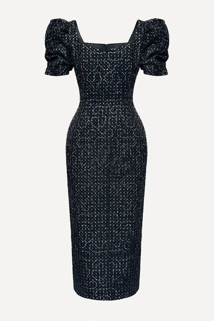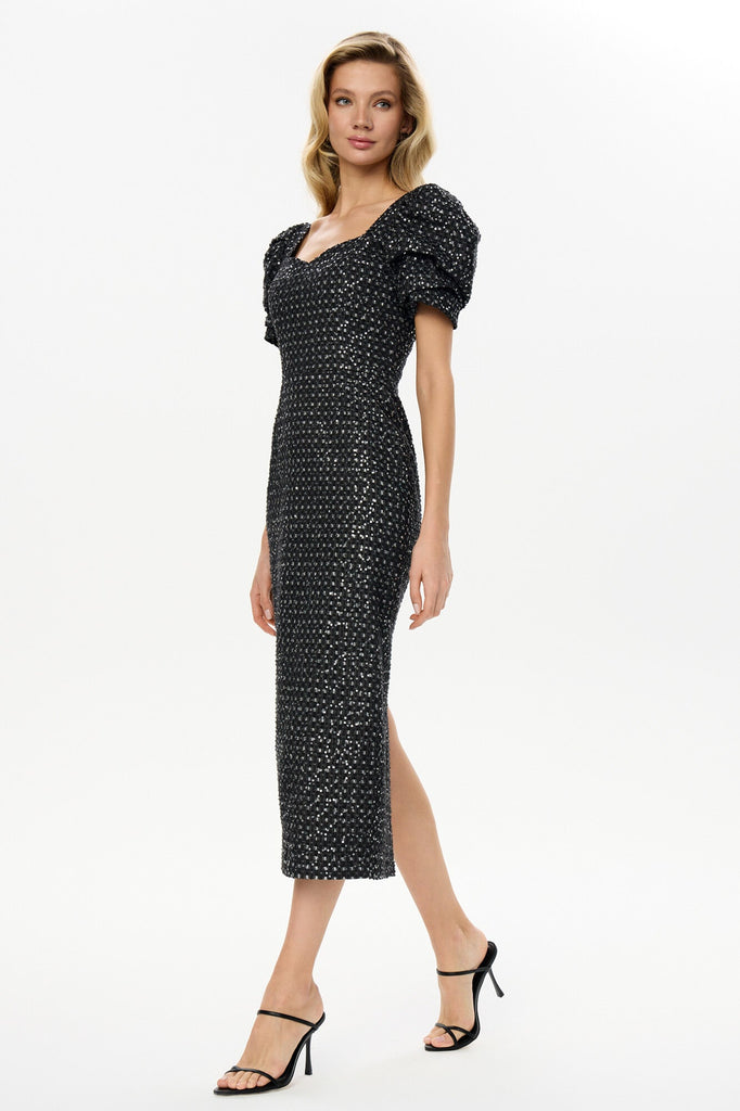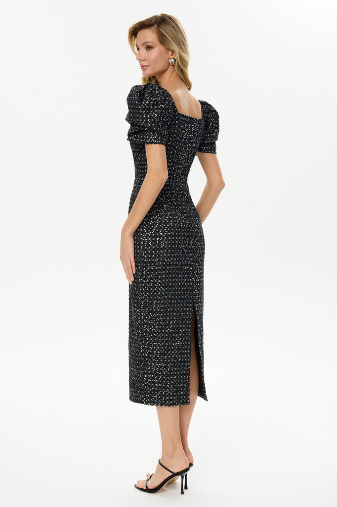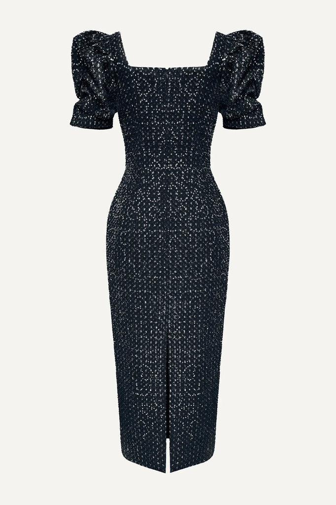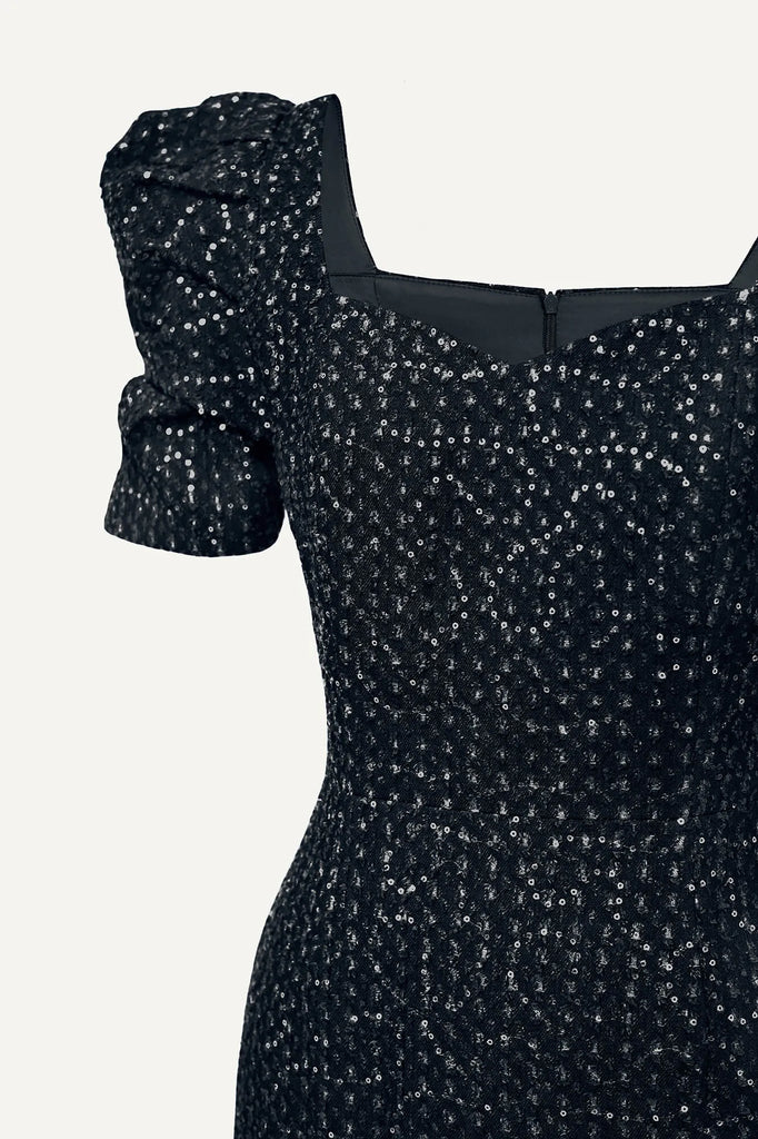 Denim Dream Dress. A classic Graphite denim midi dress with a touch of vintage charm. Voluminous sleeves and a feminine neckline accentuate the neck and collarbone, creating a delicate and playful contrast. The slit in the skirt adds a touch of elegance and sophistication, making this dress a perfect choice for any occasion, from a casual day out to a night on the town. The backless design with a delicate scoop neckline draws attention to the neck and shoulders, adding a touch of allure.