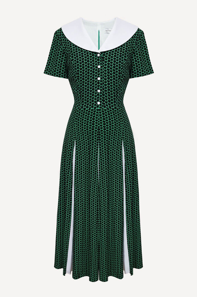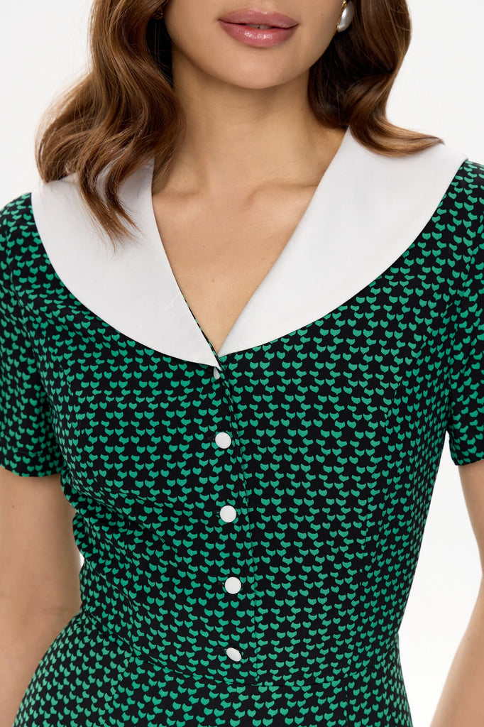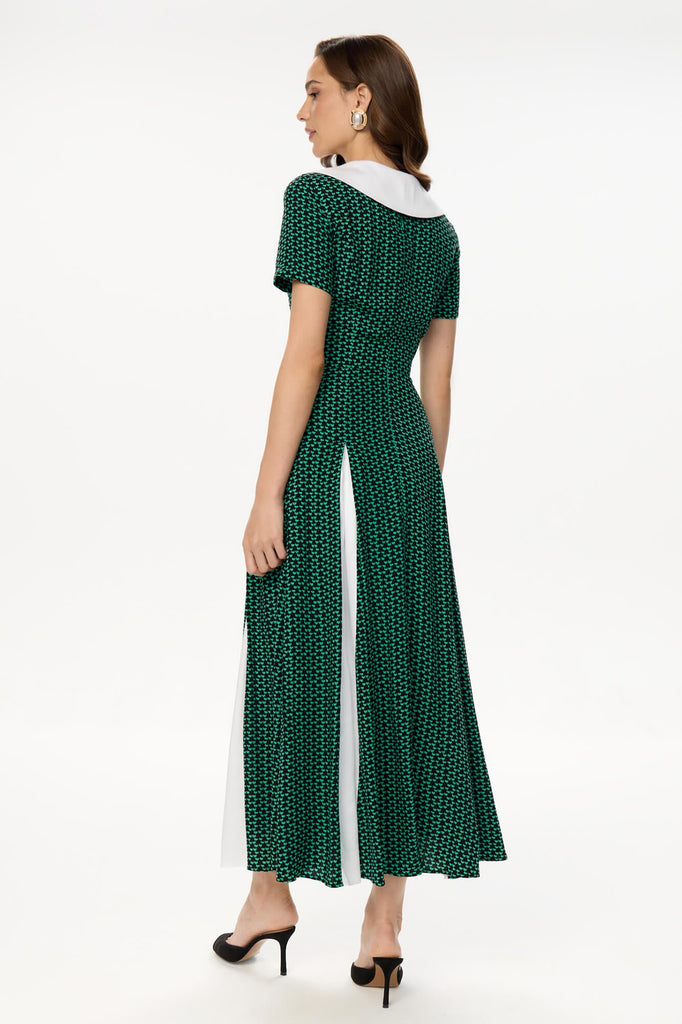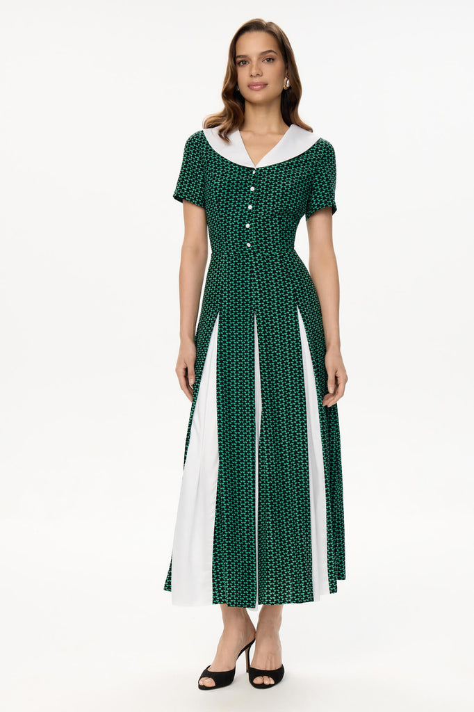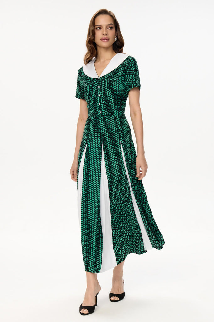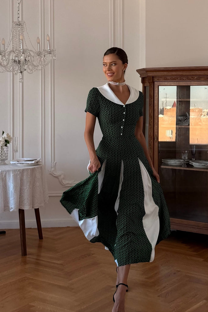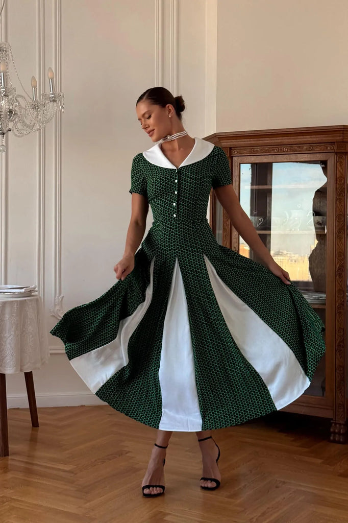 This exquisite midi dress in a rich deep green features striking white panels that add dynamism to the design and create a flattering silhouette. A contrasting white collar adds a touch of retro charm, while a neat button-down closure completes the look. The dress's loose silhouette exudes an effortless grace, and the midi length lends versatility, making it suitable for both casual and special occasions. This dress is a wardrobe staple that will turn heads wherever you go.