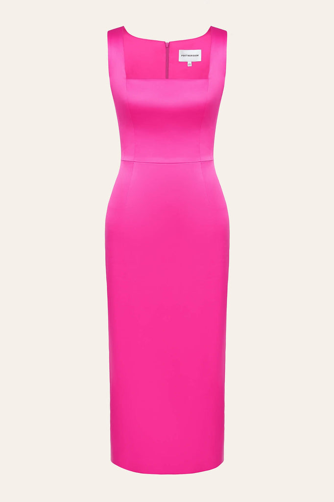 Silhouetted satin midi length dress with wide straps in fuchsia. The square neckline accentuates the neckline and visually lengthens the neck. The bodice cut-off line and fitted silhouette perfectly accentuates the female figure.