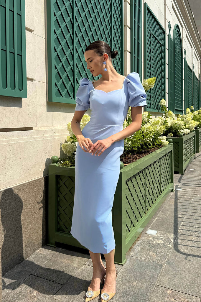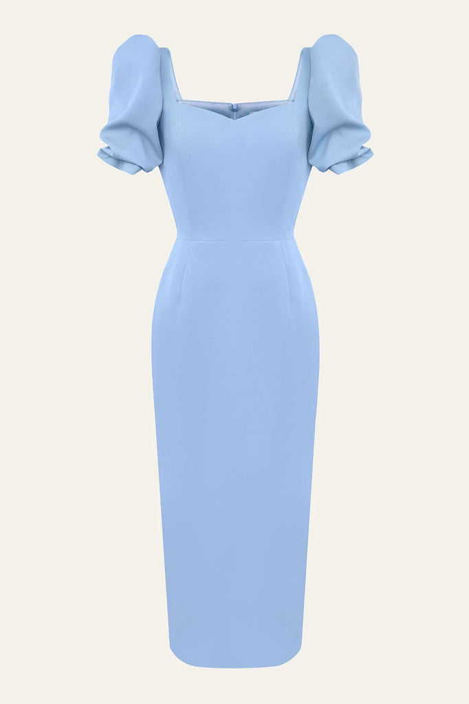 A midi length dress with puffy sleeves in blue. A curly neckline highlights the neck and collarbones area. A delicate square neckline on the back adds a feeling of romance. Enjoy elegant and sophisticated look due to straight slit skirt.