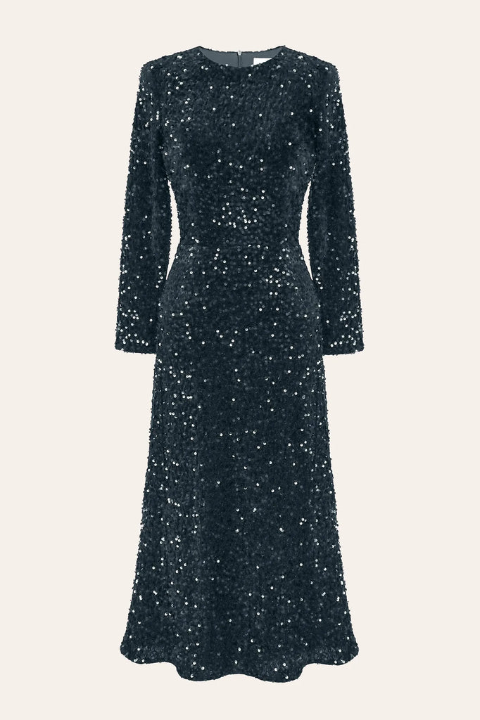 Sparkling midi length dress with long sleeves. The fabric of the product is embroidered with sequins, creating a spectacular and memorable image. The product is lined. Invisible zipper fastener.