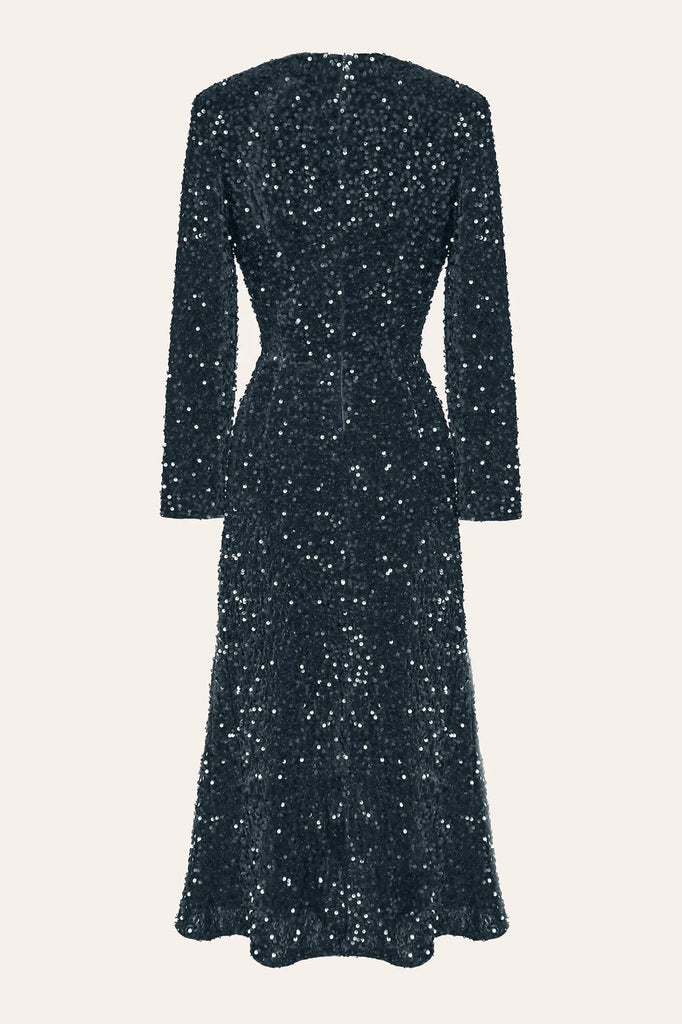 Sequin Decorated Velvet Long Sleeve Midi Dress
