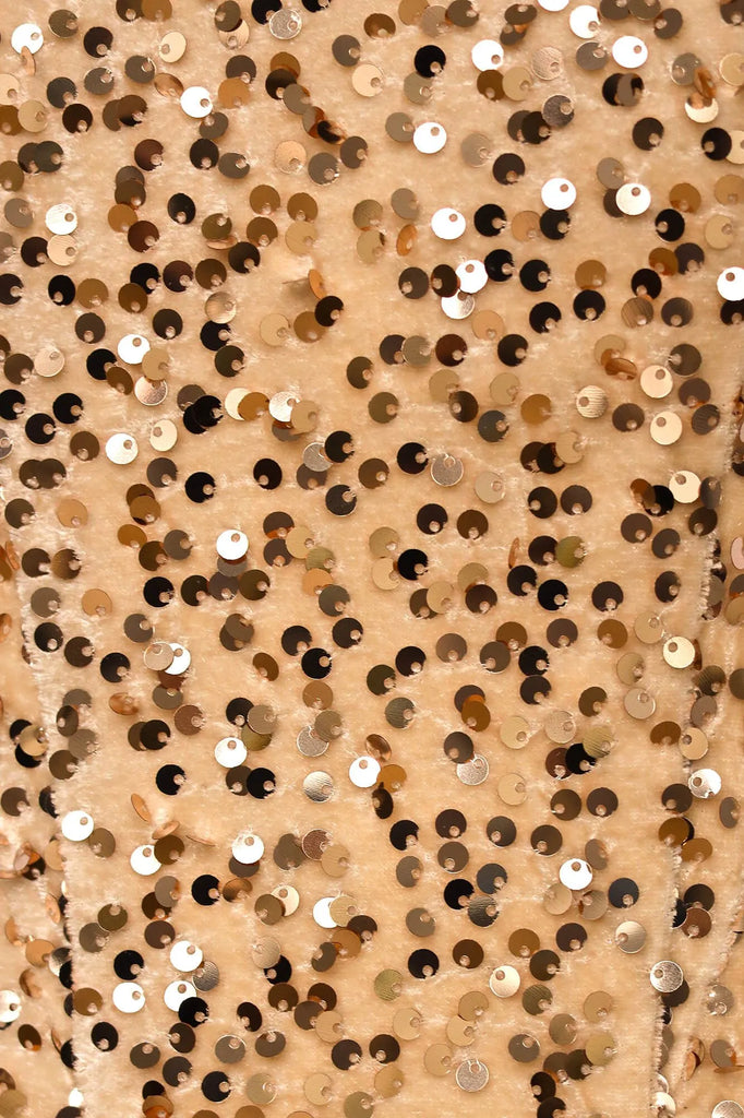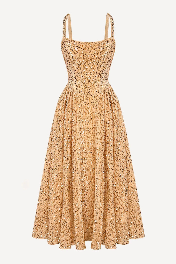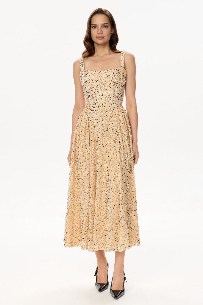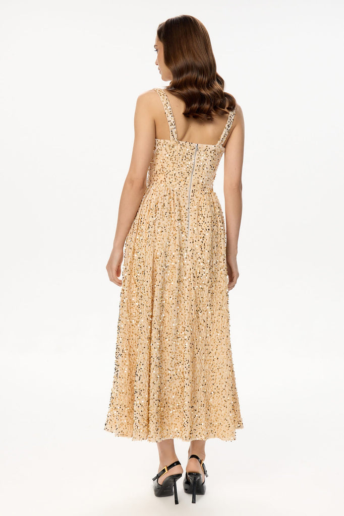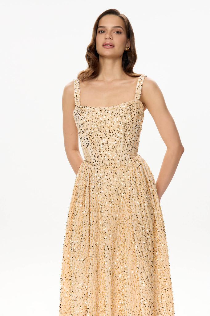 A midi dress crafted from sumptuous velvet in an exquisite gold shade, featuring wide straps and a voluminous, flowing skirt. The dazzling fabric, adorned with sequins, radiates glamour and opulence. The deep neckline elegantly highlights the décolletage and collarbone, while the structured corset design ensures a flawless fit, accentuating your graceful contours and adding a touch of irresistible femininity and allure.