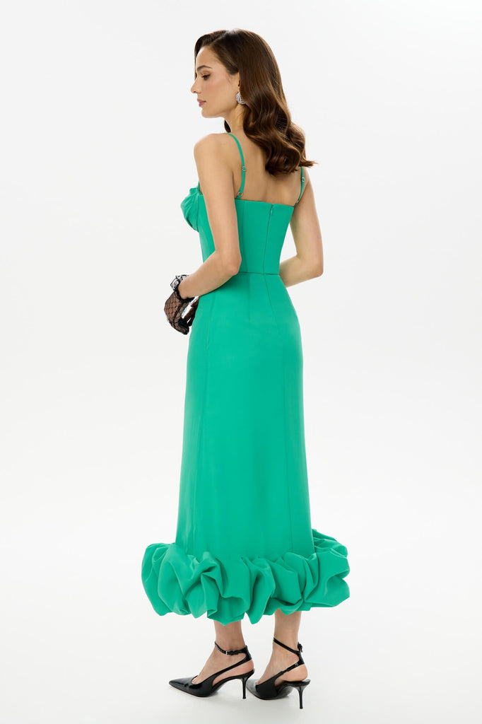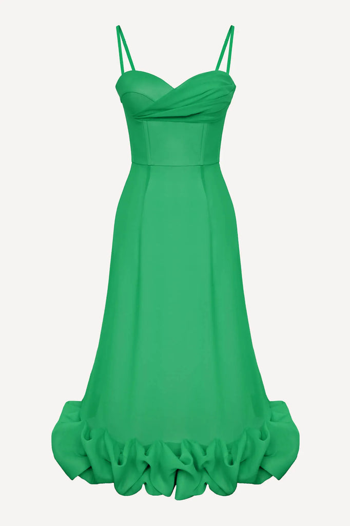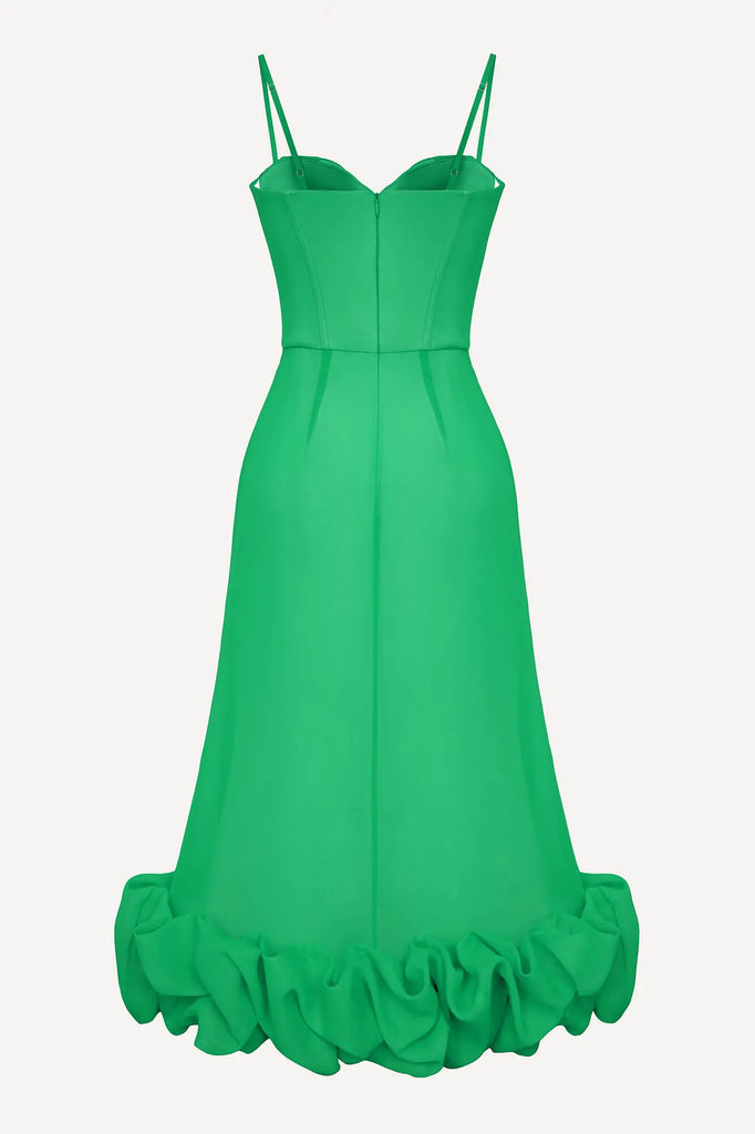 Flounce Bustier Midi Dress in green color. The corset with bones and cups flatters the body shape while the flounce in the bottom creates a dreamy and romantic feel. The dress fastens with a hidden zipper. Lined.