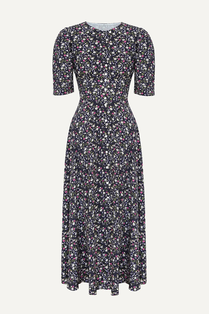 A Button Front Midi Dress in Navy. Floral print, contrasting lining. Puffy sleeves and a flying skirt gives a feeling of airiness and lightness. Adjust the depth of the neckline and the cut of the dress and let your mood create a special look. Make a playful look by a little buttoning or embrace your inner lady show.
