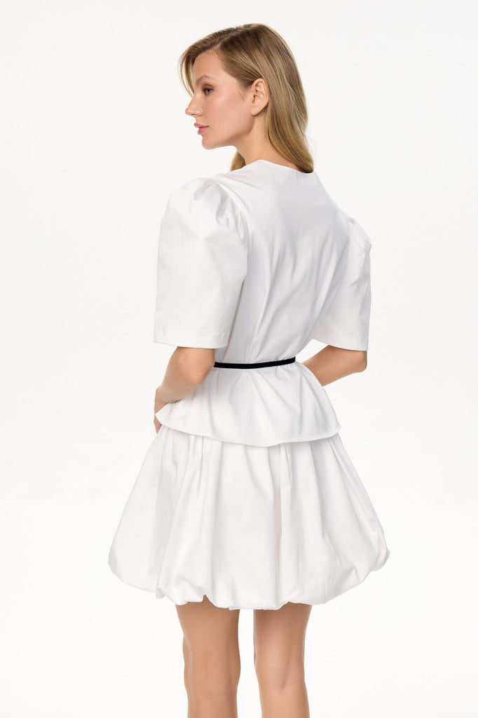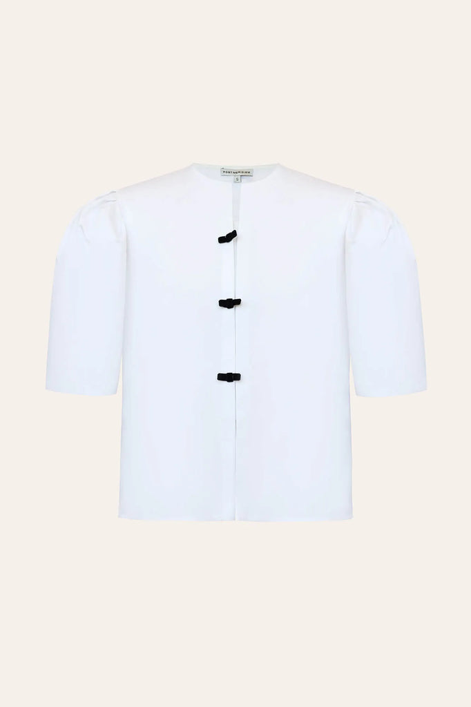 A loose-fitting, white cotton blouse. This classic blouse features billowing lantern sleeves for a light and romantic look. The button closure with contrasting accents adds a touch of edge.
