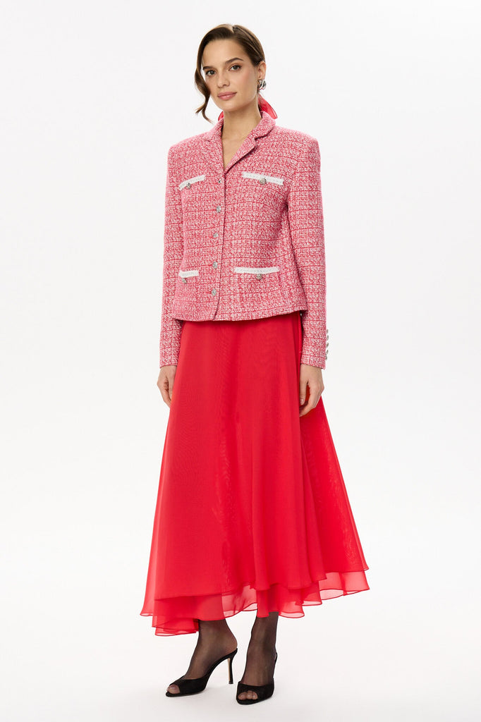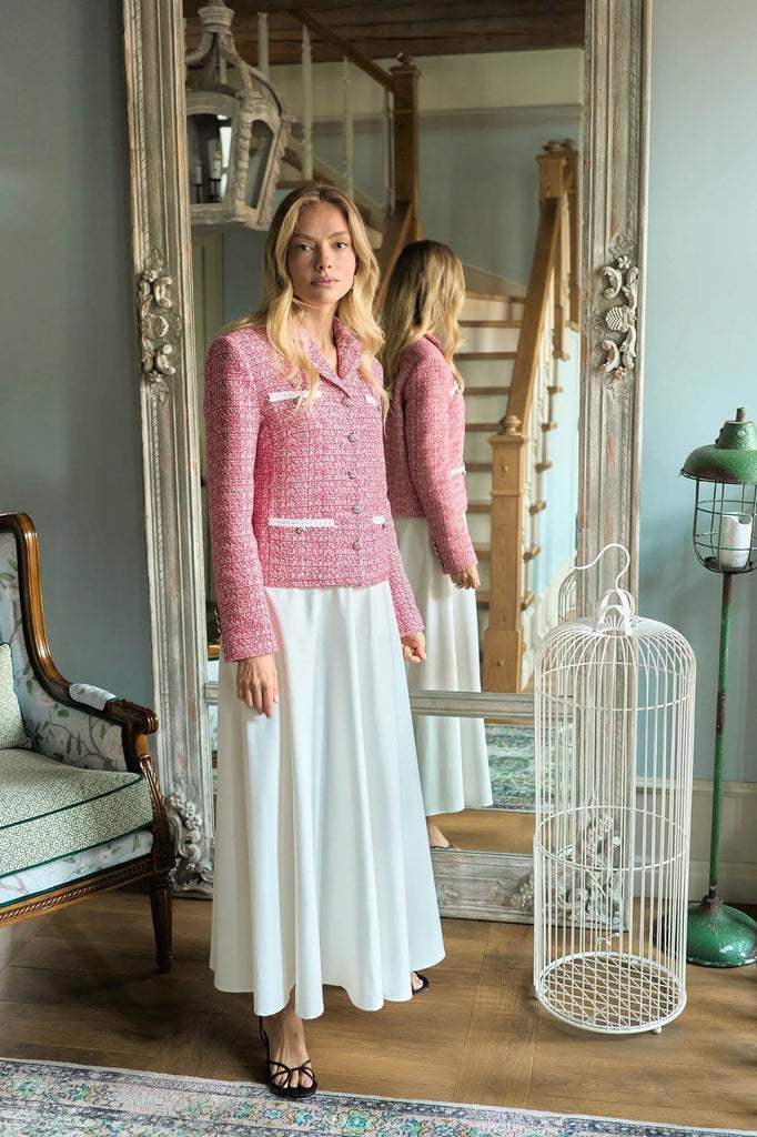 Buttoned cropped jacket creates exquisite feminine look. Amazing juicy color duo of white and pink in a black outline vichy plaid pattern. Black velvet pockets and collar make an attractive contrast on the garment. The jacket is perfect to wear with wide trousers, classic or flared jeans, skirts and any styled dresses.