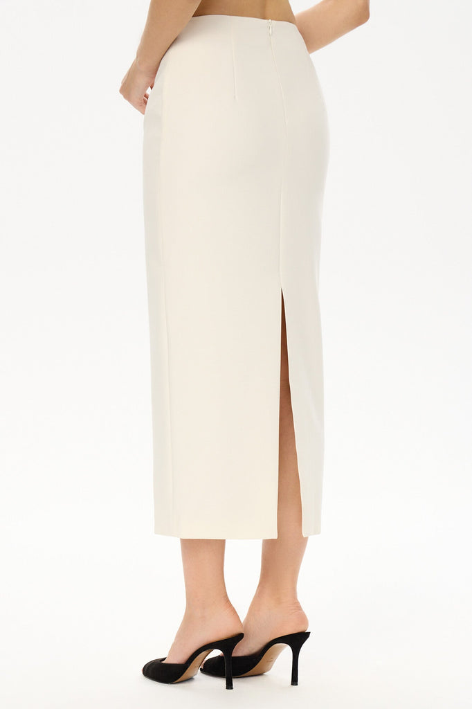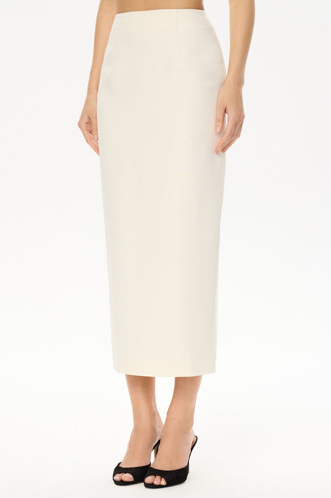 A classic Ivory maxi skirt. Sheath silhouettes emphasizes the figure and Italian fine-wool provides incredible comfort and lightness. It fastens with a hidden zipper. To complete the look wear it with a top or a bodysuit from the new collection.