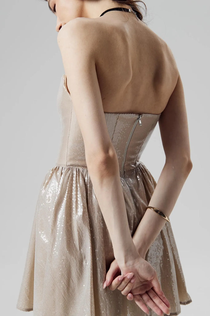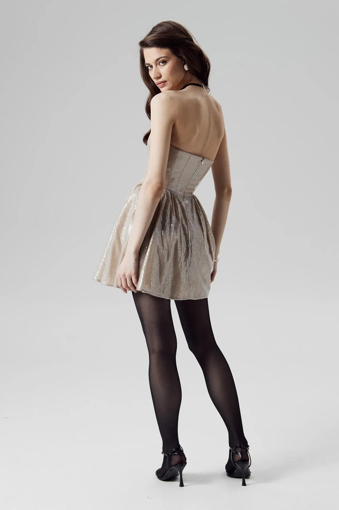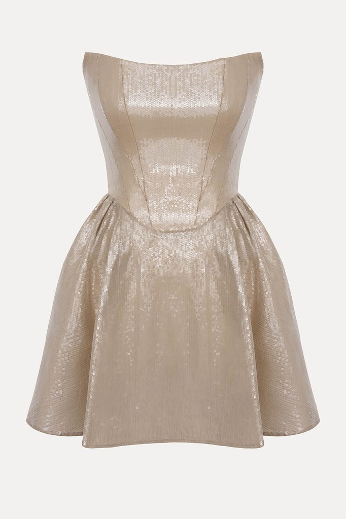 A fitted Gold bustier dress in shimmering fabric. This show-stopping dress boasts a mini-length silhouette, a structured corset, and a voluminous skirt for a dramatic look. Fully lined for added comfort.