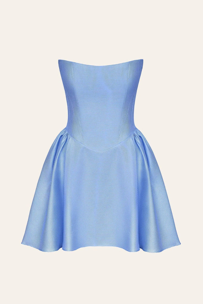 Bustier Mini Dress with a figured corset in light blue. A feminine full skirt. The inner design of the bodice has underwire bones. Lined.