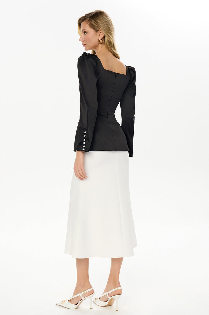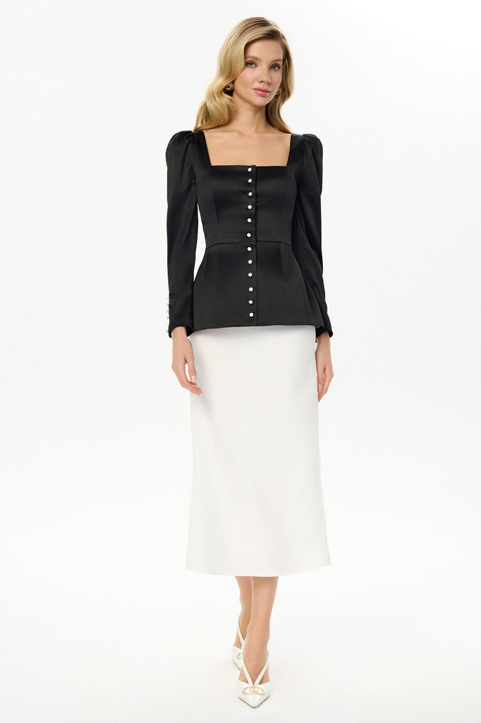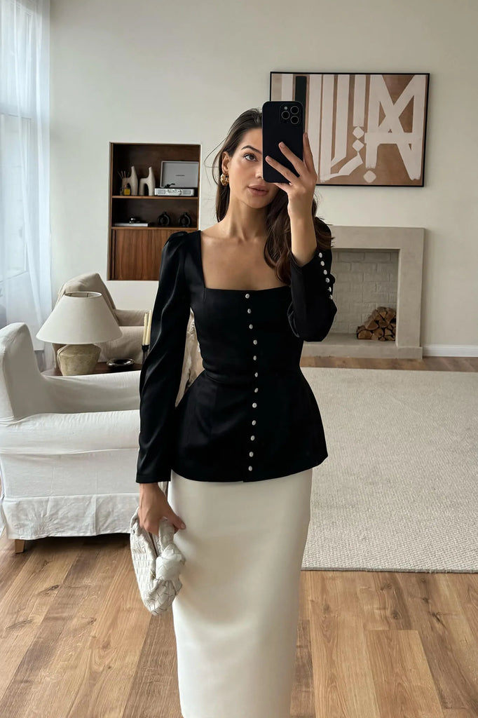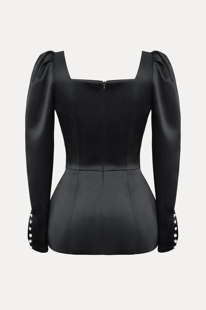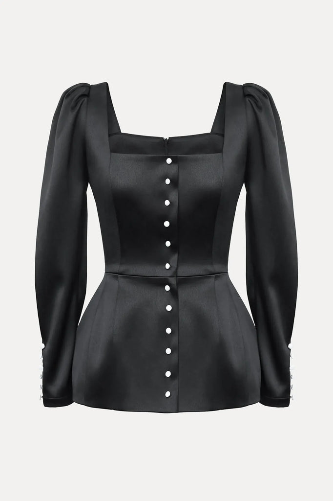 This opulent black satin top exudes elegance. The square neckline beautifully showcases the décolletage and collarbones, while the long, voluminous sleeves add a touch of drama and sophistication. A fitted silhouette with a peplum and contrasting buttons completes the refined look, ideal for special occasions. Pair with a matching satin pencil skirt for a truly luxurious ensemble.