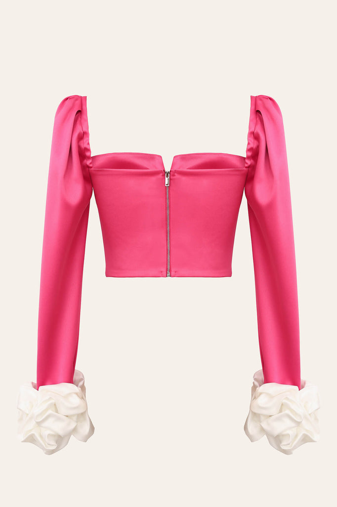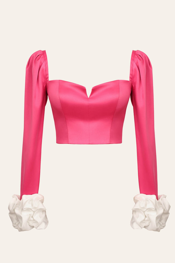 Complete your basic or night out outfit with our satin top with a shaped neckline and long draped sleeves.The deep neckline emphasizes the neckline and collarbones, and the voluminous elongated sleeves create an expressive accent, adding femininity and sophistication to the image. The voluminous contrasting cuffs, made in a "meringue" assembly and adding notes of solemnity and theatricality, act as an accent detail. The cuffs can be removed, turning the top into an elegant element of a restrained classic image.
