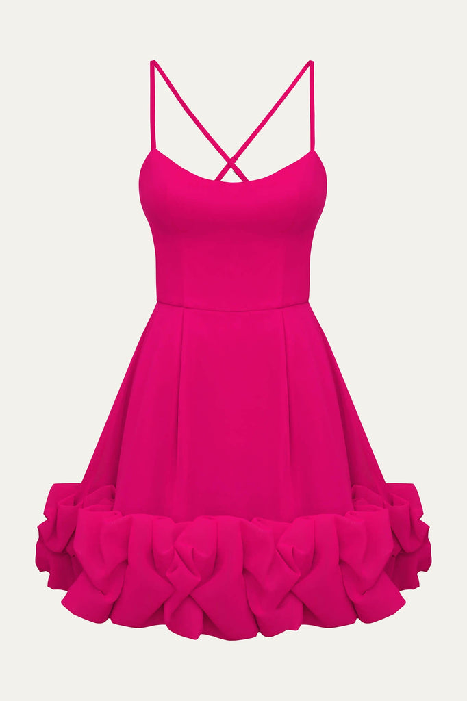 Bustier mini dress with a built-in corset, the fabric with a touch of a light satin gloss is assembled in a beautifully shaped flounce at the bottom. The crossed thin straps on the back give off a seductive message for those in the behind. This dress is a perfect option for a romantic late dinner. Lined.
