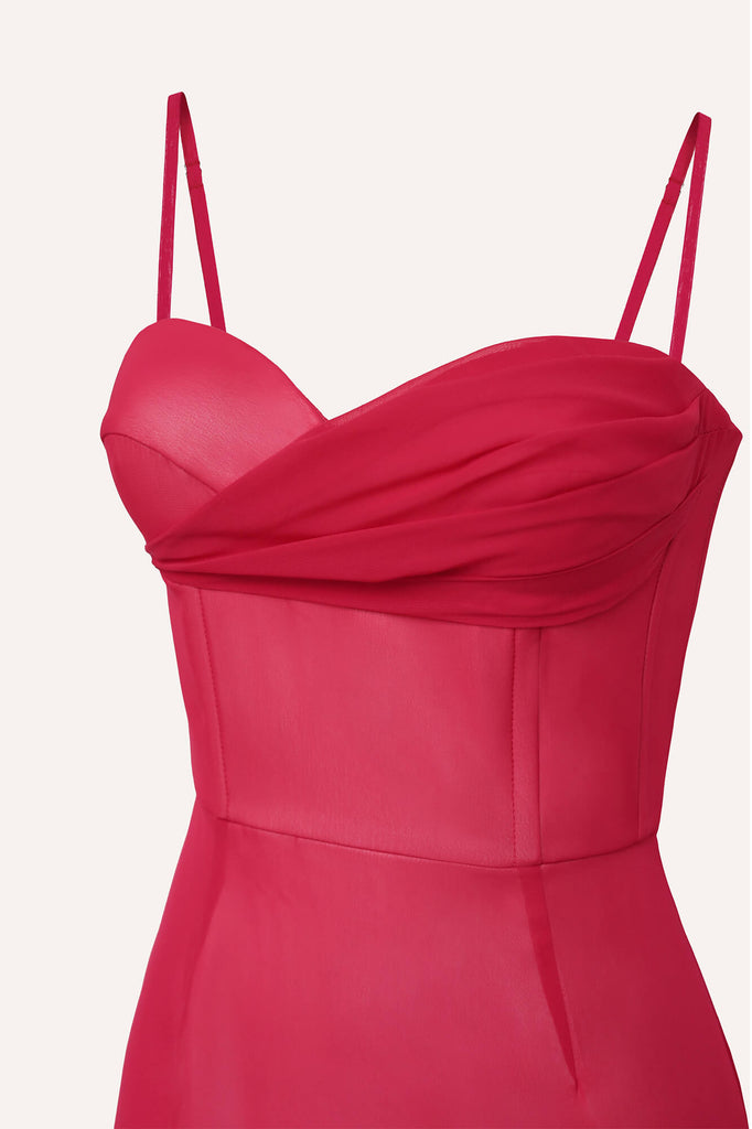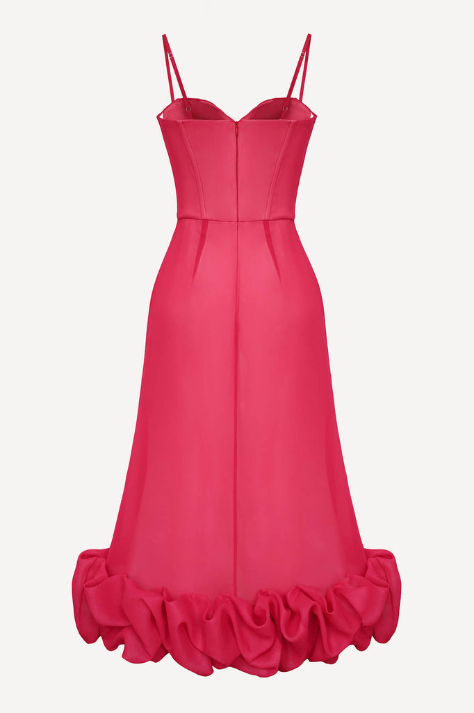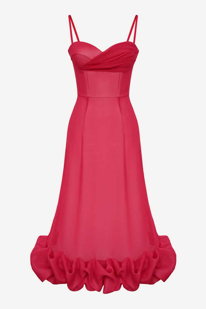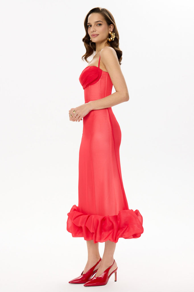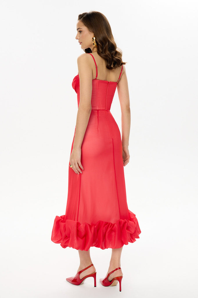 Flounce Bustier Midi Dress in red color. The corset with bones and cups flatters the body shape while the flounce in the bottom creates a dreamy and romantic feel. The dress fastens with a hidden zipper. Lined.