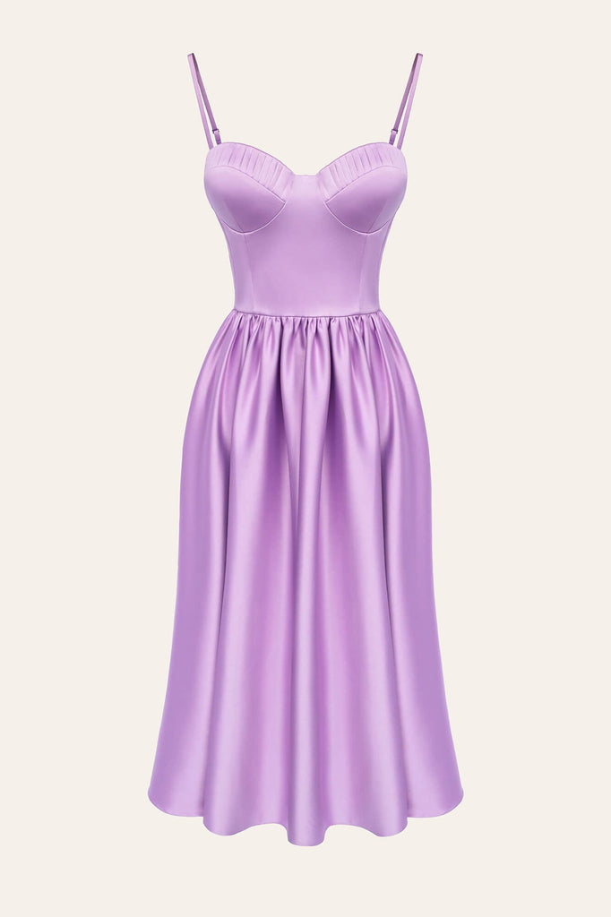 Bustier dress in midi length in Lavender color. Allure your femininity by the dress design with deep neckline and pleats on the cups. The corset of bones and cups supports and emphasizes the chest. Lined.