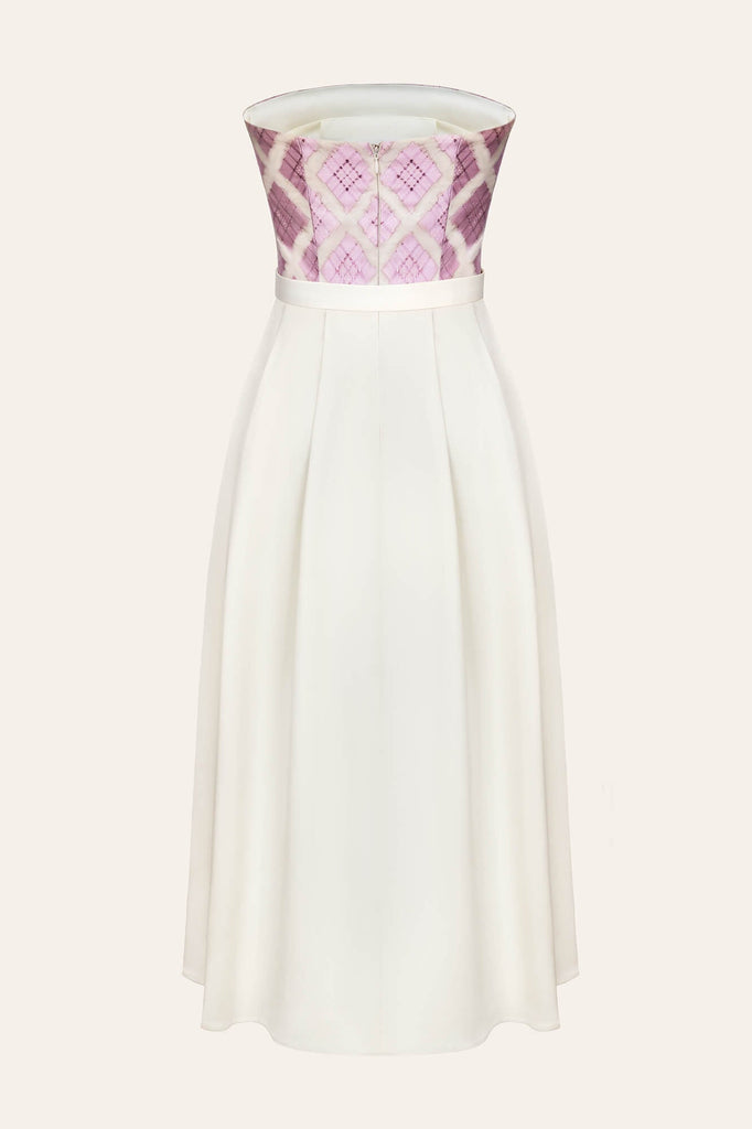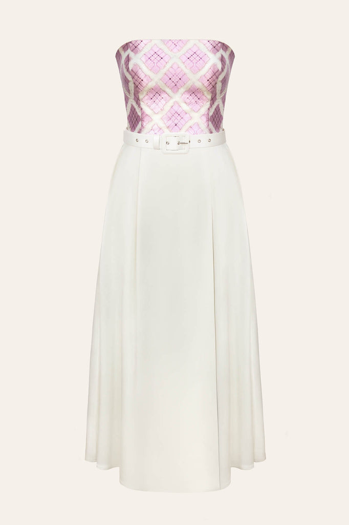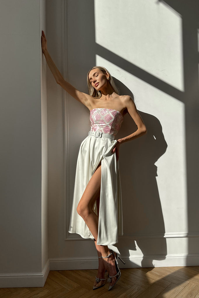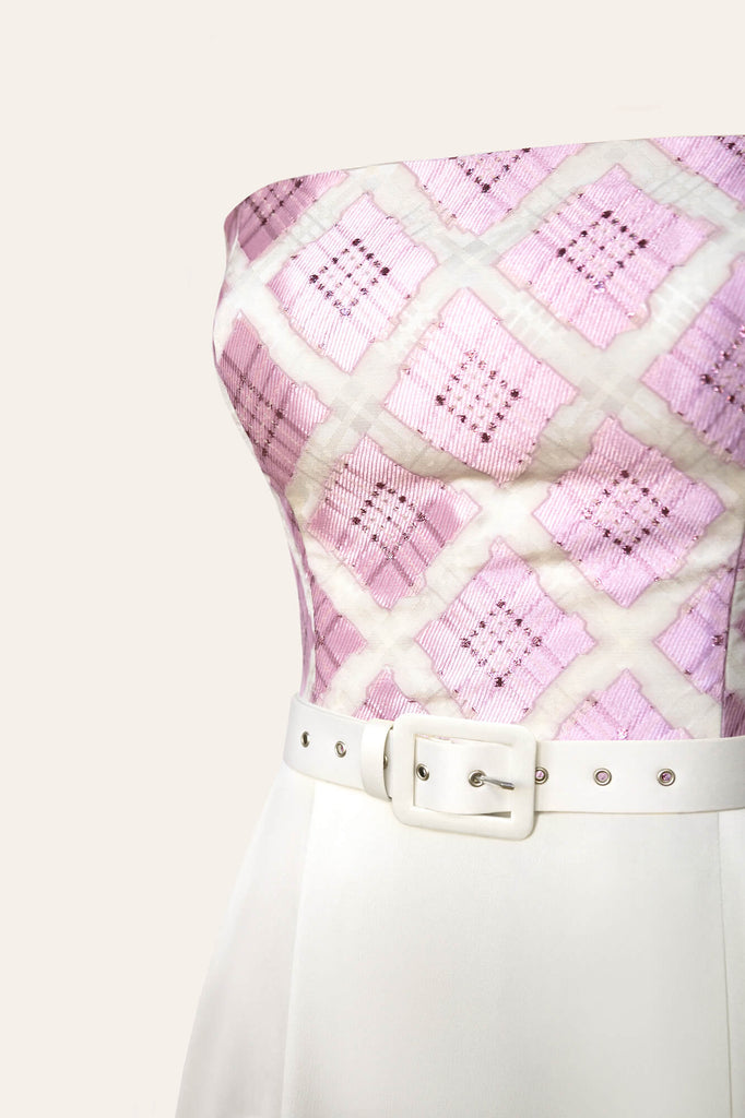 A two-piece off-shoulder dress in midi-length. A bustier top with a pink and white checkered ornament accentuates the neckline and shoulders, a pearl-colored petticoat with a high side slit and a matching belt will embellish all the advantages of the figure.