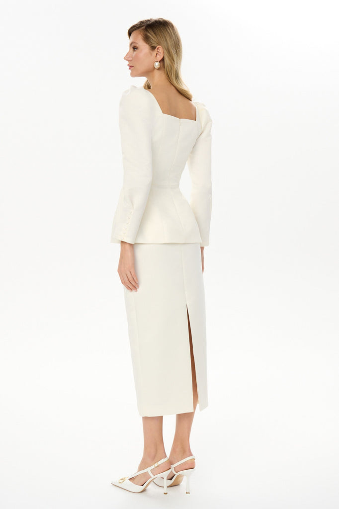 This opulent milk satin top exudes elegance. The square neckline beautifully showcases the décolletage and collarbones, while the long, voluminous sleeves add a touch of drama and sophistication. A fitted silhouette with a peplum and contrasting buttons completes the refined look, ideal for special occasions. Pair with a matching satin pencil skirt for a truly luxurious ensemble.