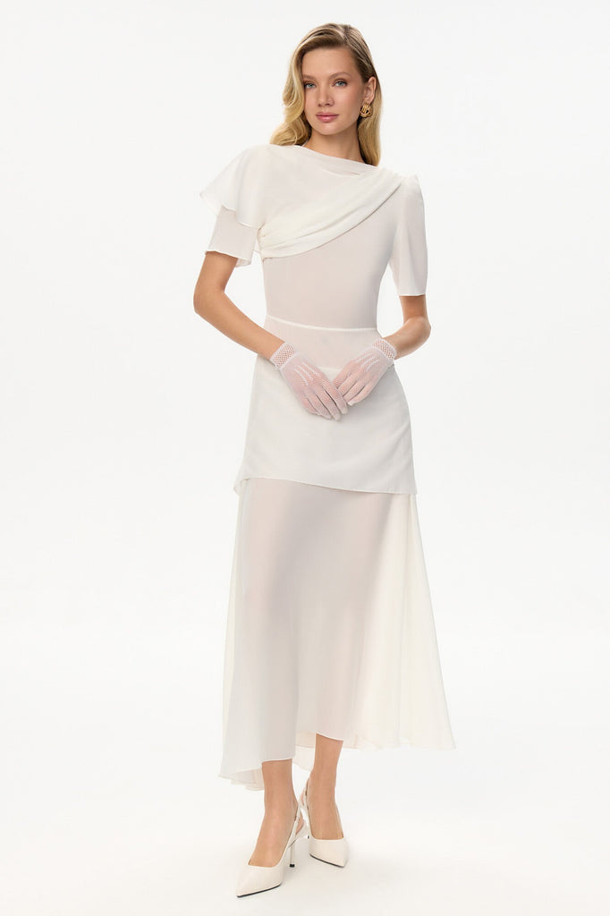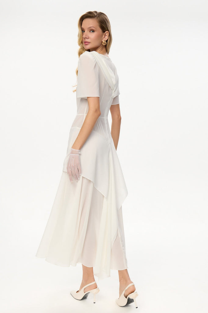 A midi dress of flowing, weightless chiffon with an asymmetrical cut, double skirt, and delicate draping—a manifesto of femininity, passion, and mystery, standing among the season’s defining trends. Concealed yet intoxicatingly sensual. The diaphanous fabric skims the silhouette, teasing the imagination, while the soft folds whisper of hidden allure.