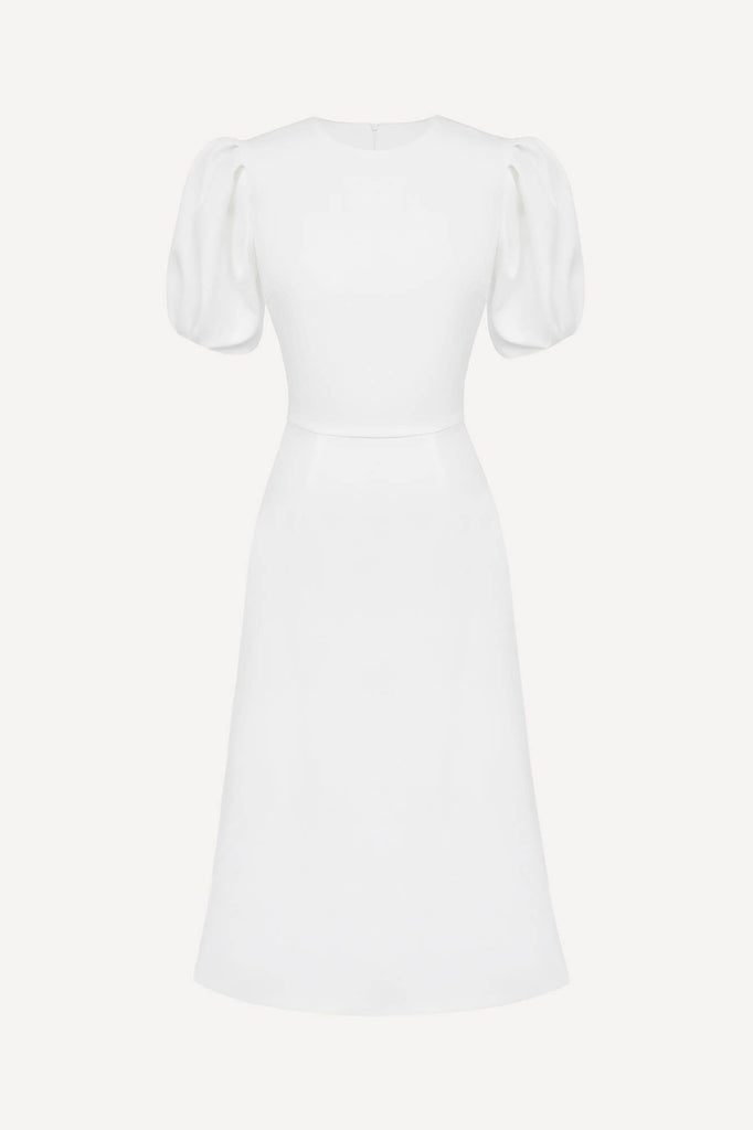 A simple chic midi godet dress in white, an easy go-for option for every occasion. The dress has a fitted cut with a classic round neck and puffy sleeves that flatters rounded, full arms. The dress favorably emphasizes the silhouette, tightly fitting the hips and expanding to the bottom.