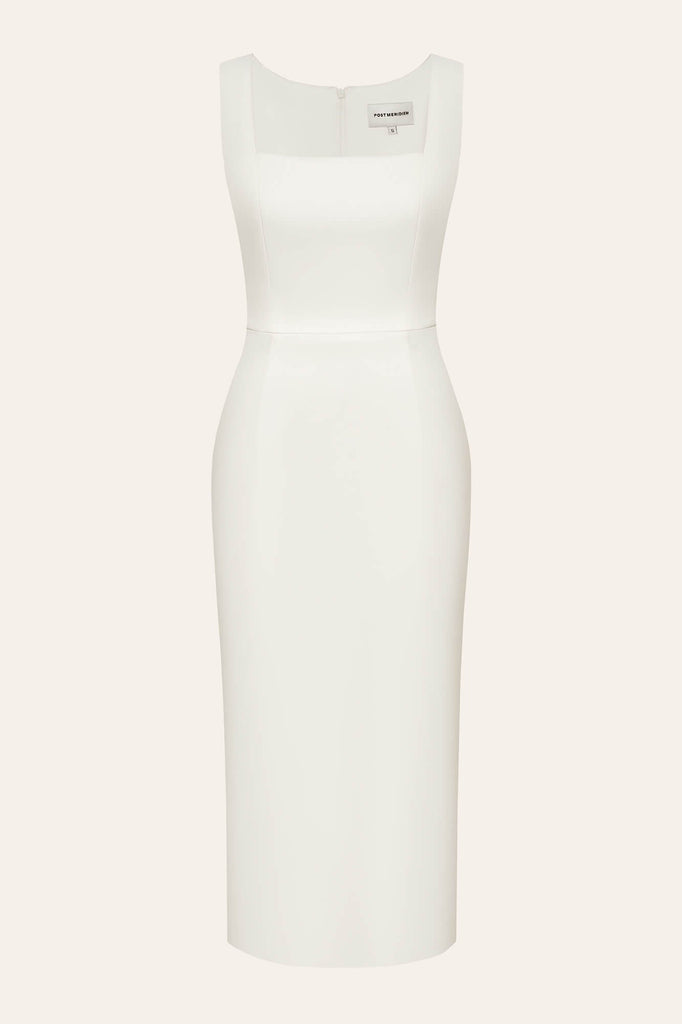 Silhouetted satin midi length dress with wide straps in milk. The square neckline accentuates the neckline and visually lengthens the neck. The bodice cut-off line and fitted silhouette perfectly accentuates the female figure.