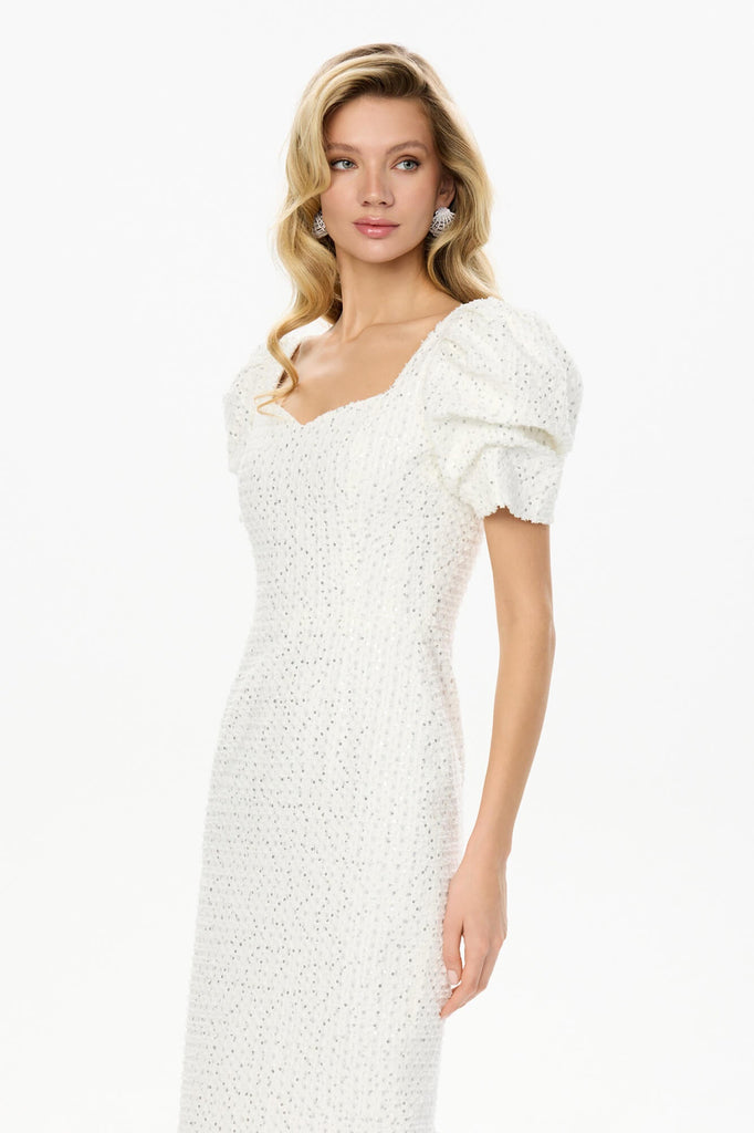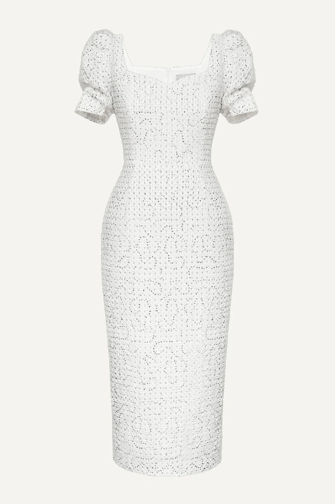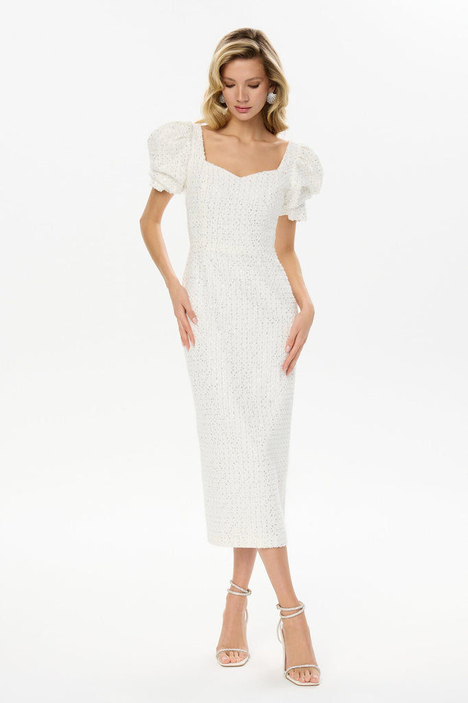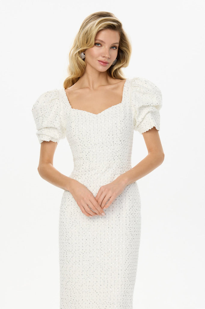 Denim Dream Dress. A classic milk denim midi dress with a touch of vintage charm. Voluminous sleeves and a feminine neckline accentuate the neck and collarbone, creating a delicate and playful contrast. The slit in the skirt adds a touch of elegance and sophistication, making this dress a perfect choice for any occasion, from a casual day out to a night on the town. The backless design with a delicate scoop neckline draws attention to the neck and shoulders, adding a touch of allure.