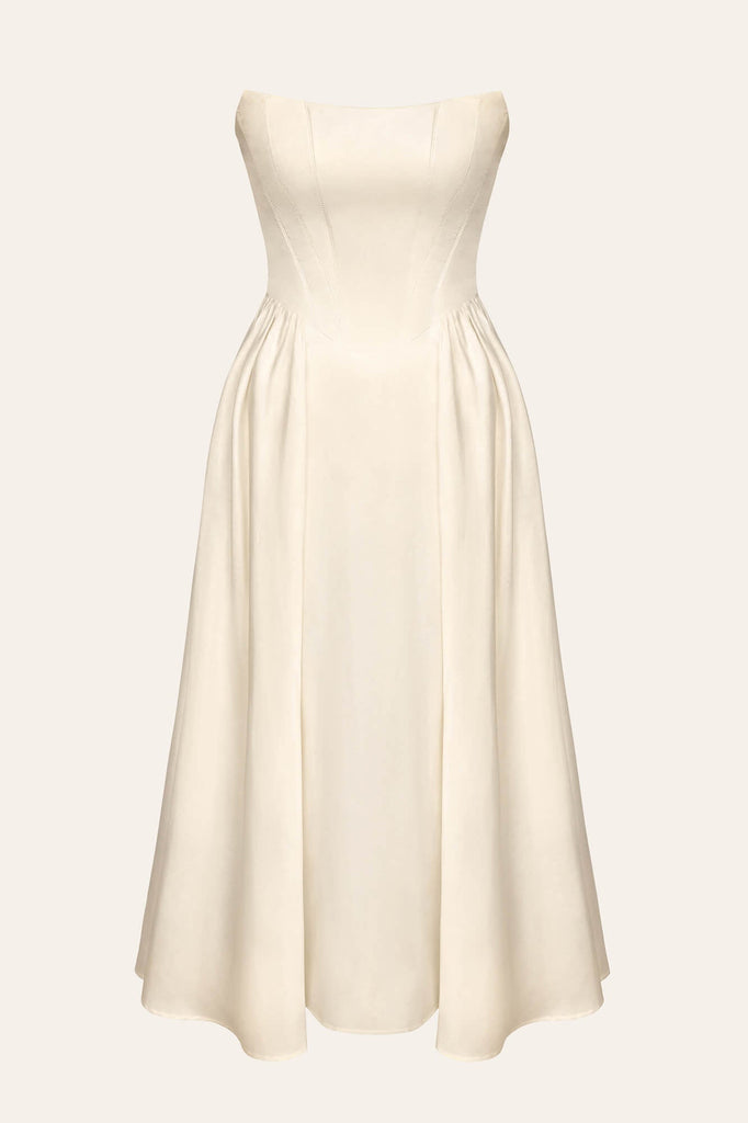 Bustier Midi Dress with a figured corset in Ivory. A feminine full skirt. Due to the multiple tucks the dress fits the body just perfect. The deep shaped neckline accentuates the collarbones and neckline area. Lined.