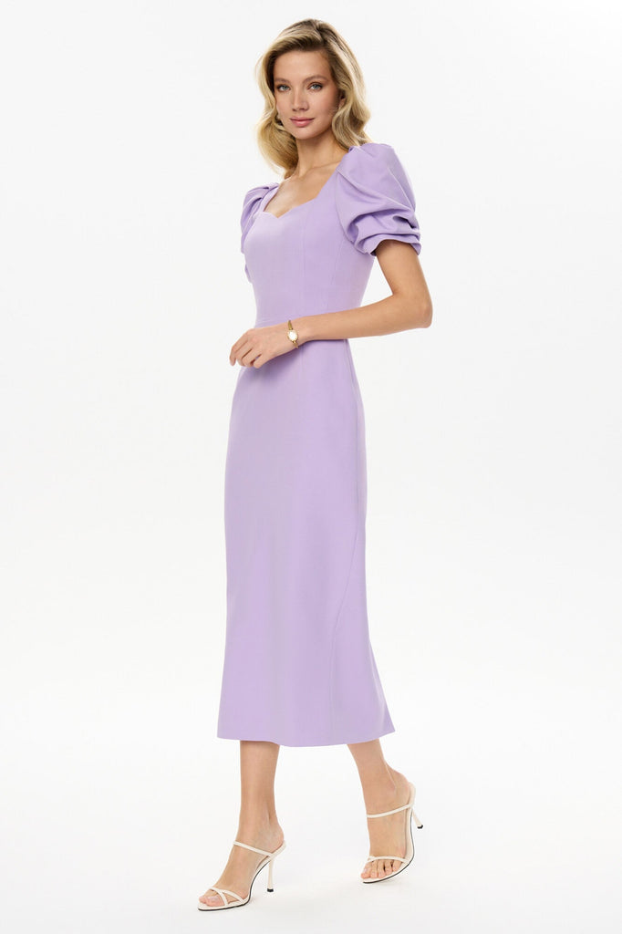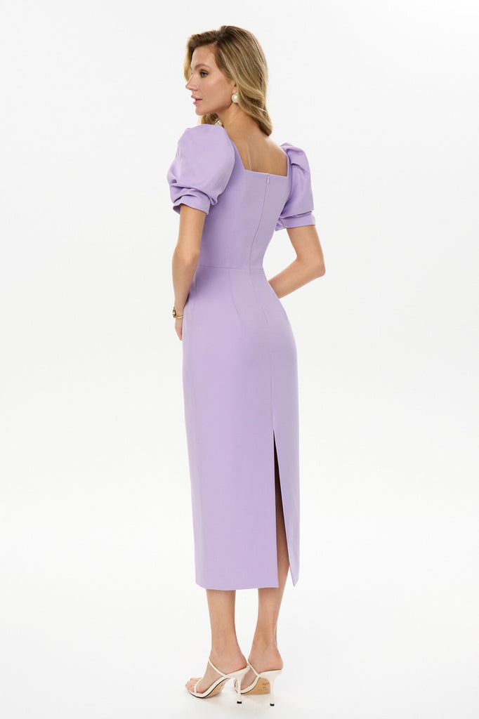 A midi length dress with puffy sleeves in Lavender. A curly neckline highlights the neck and collarbones area. A delicate square neckline on the back adds a feeling of romance. Enjoy elegant and sophisticated look due to straight slit skirt.