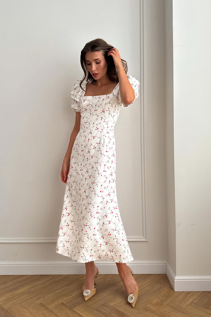 Tea party in the garden with the closests. This silhouette midi dress in Raspberries with a godet skirt is for those who opt for a classy look but want to add a little zest while keeping it minimalistic. Trendy square neck makes the appearance elegant and short sleeves make this garment perfect to be your lovely summer outfit. Lined.