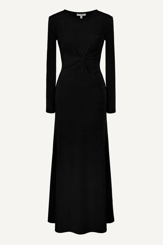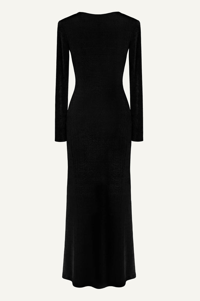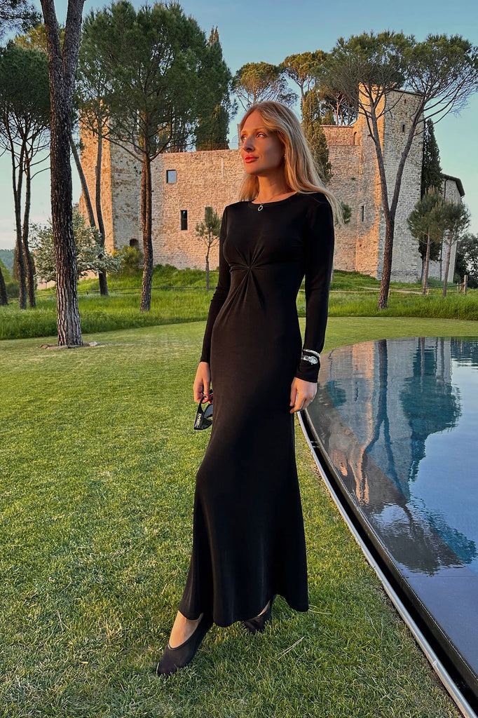A light maxi length dress made of thin flowing black knitwear. A simple model will emphasize all the advantages of your figure and provide comfort while moving. The bodice line is decorated with a gathered detail. Perfect for both everyday wear and evening dinner.