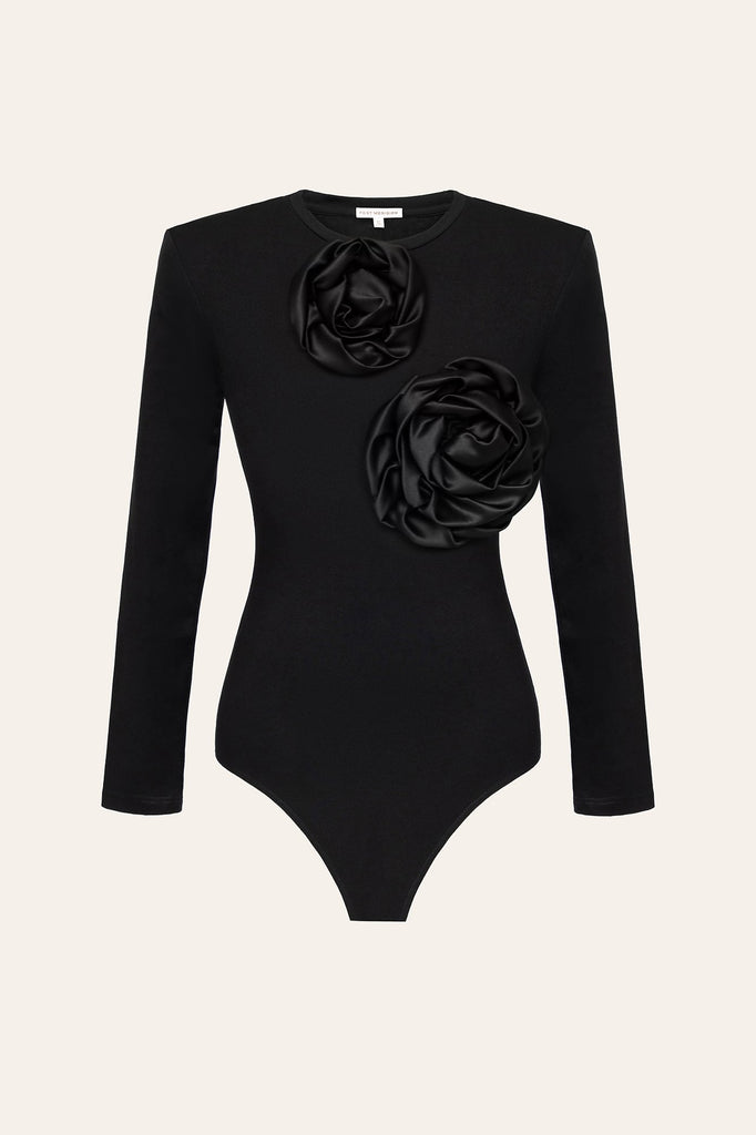 Black jersey bodysuit is a wonderful choice for a casual chic look paired with basic jeans or skirt and comfy leather sandals. The bodysuit is embellished with voluminous roses made of jersey. Stretchy cotton fabric emphasizes the curves of the body and feels soft to the skin.
