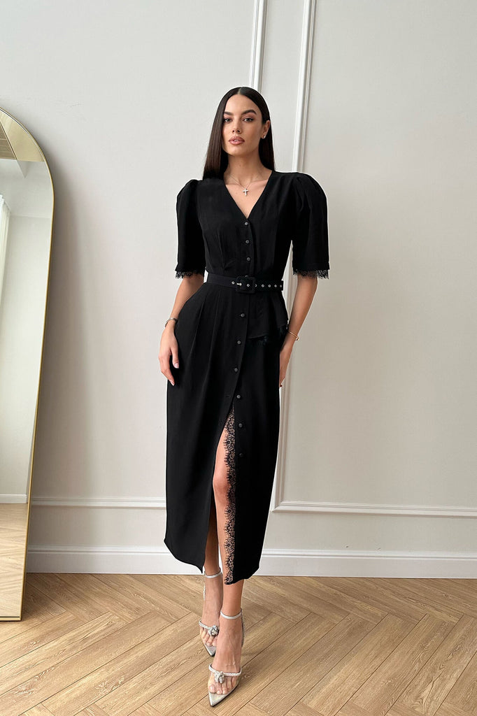 Lace Decorated Button Front Midi Dress with Belt