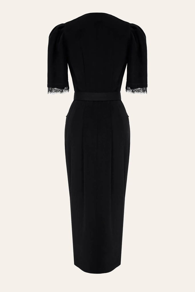The dress aesthetic is all about evoking nostalgia and femininity. Midi length dress with buttons. Delicate lace trim on the sleeves and skirt add romantic notes. The elegant V-neck accentuates the neck and collarbones.