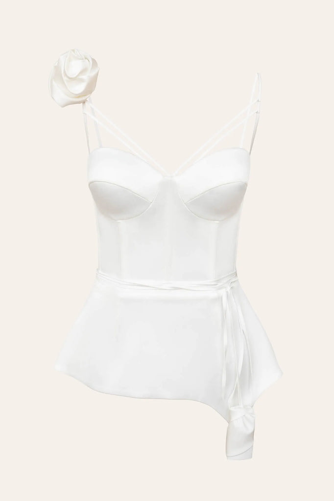 Bustier top decorated with a rose. The satin has a delicate shine. The inner construction of the bodice has underwire and cups. The fitted cut with a peplum perfectly holds its shape and emphasizes the refinement of the waist. Combine with our viscose skirts or jeans.