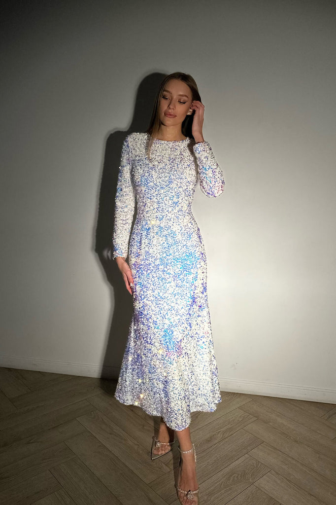 Sparkling midi length dress with long sleeves. The fabric of the product is embroidered with sequins, creating a spectacular and memorable image. The product is lined. Invisible zipper fastener.