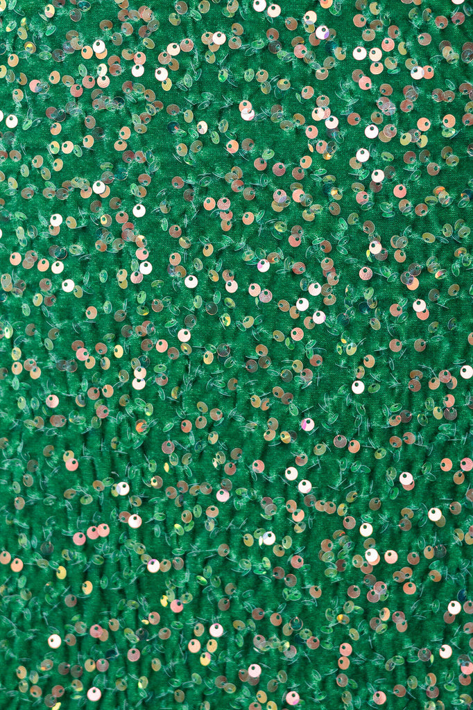 Puffy short sleeves midi dress in Light green. The garment has a fitted cut with a classic round neckline. Absolutely impressive sparkling fabric embroidered with golden sequins.