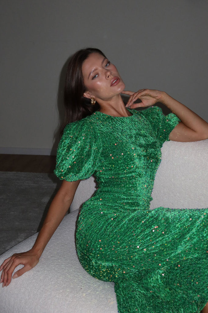 Sequin Decorated Velvet Puff Sleeve Midi Dress
