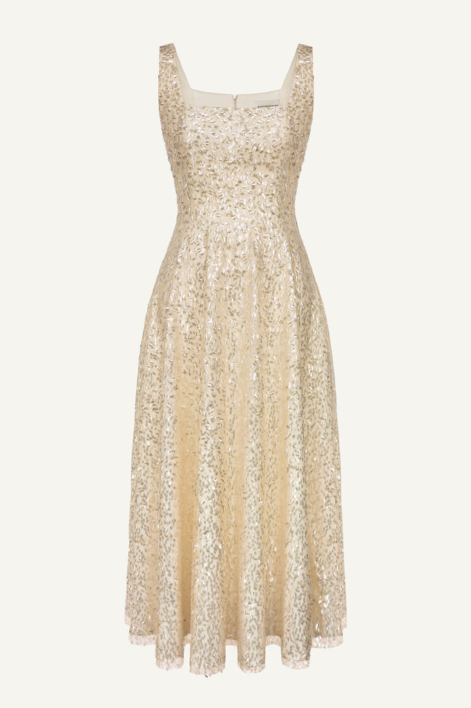A midi length dress with a square neckline. Wide straps in noble golden beige. The sparkling fabric embroidered with sequins creates spectacular and luxurious look. Fluffy skirt creates light and playful vibes. Perfect dinner dress or dream date night outfit.
