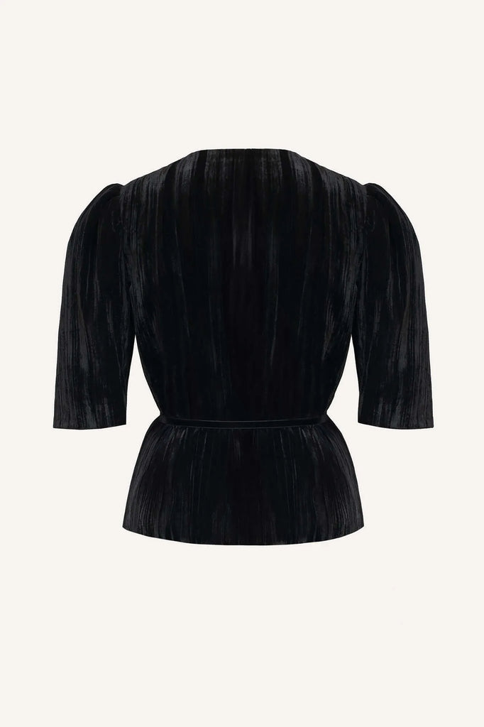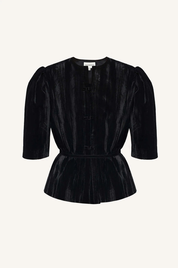 A loose-fitting, deep black velvet blouse. The billowing, lantern sleeves create a floaty and romantic effect, while a delicate belt cinches in the waist. Button closure adds a touch of sophistication.